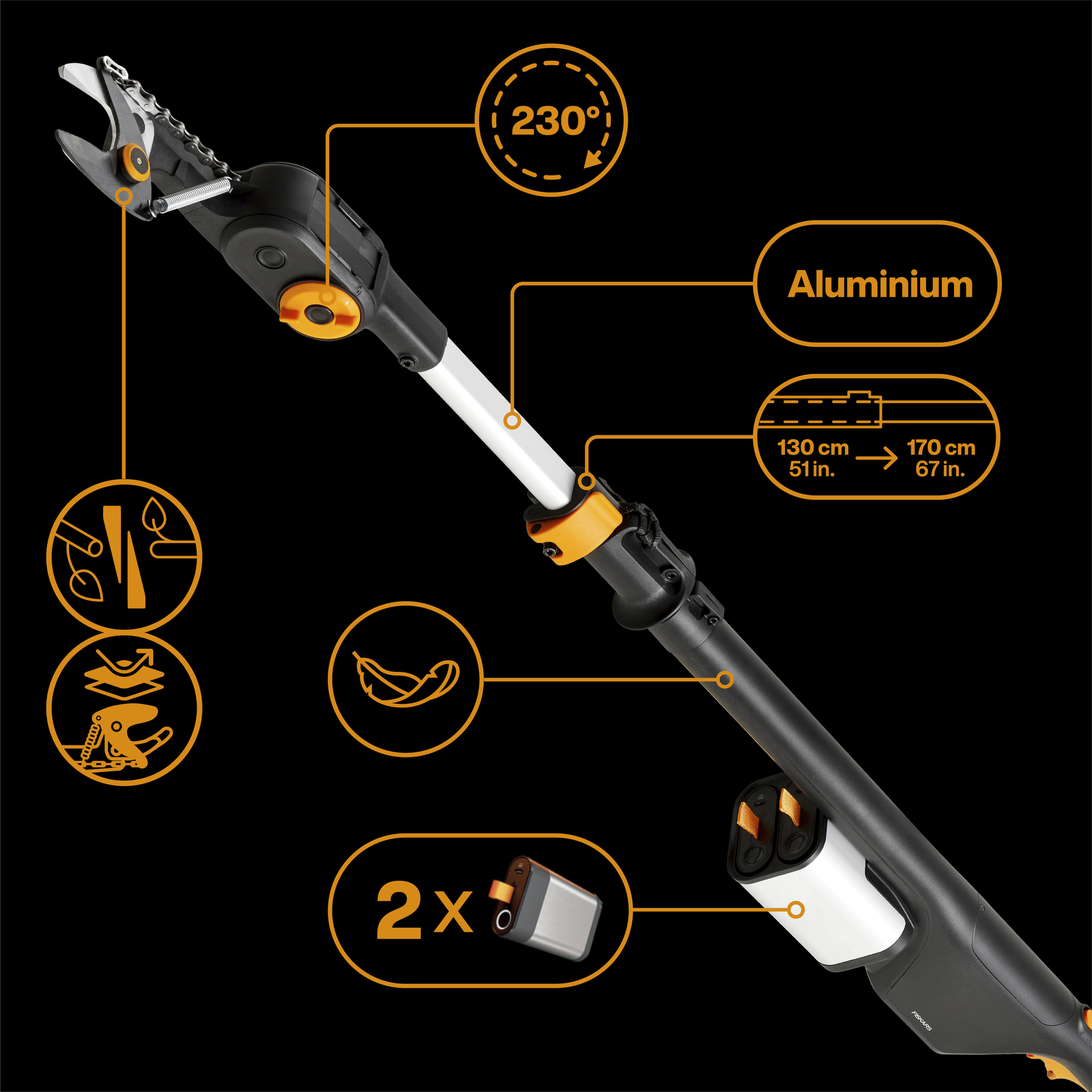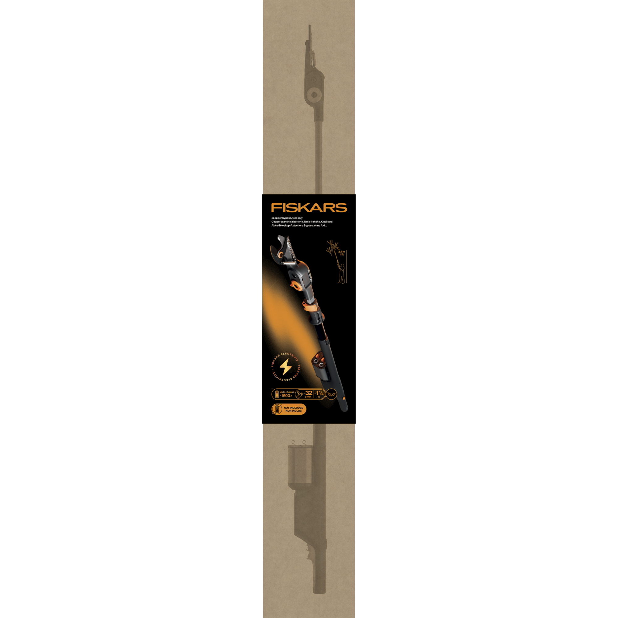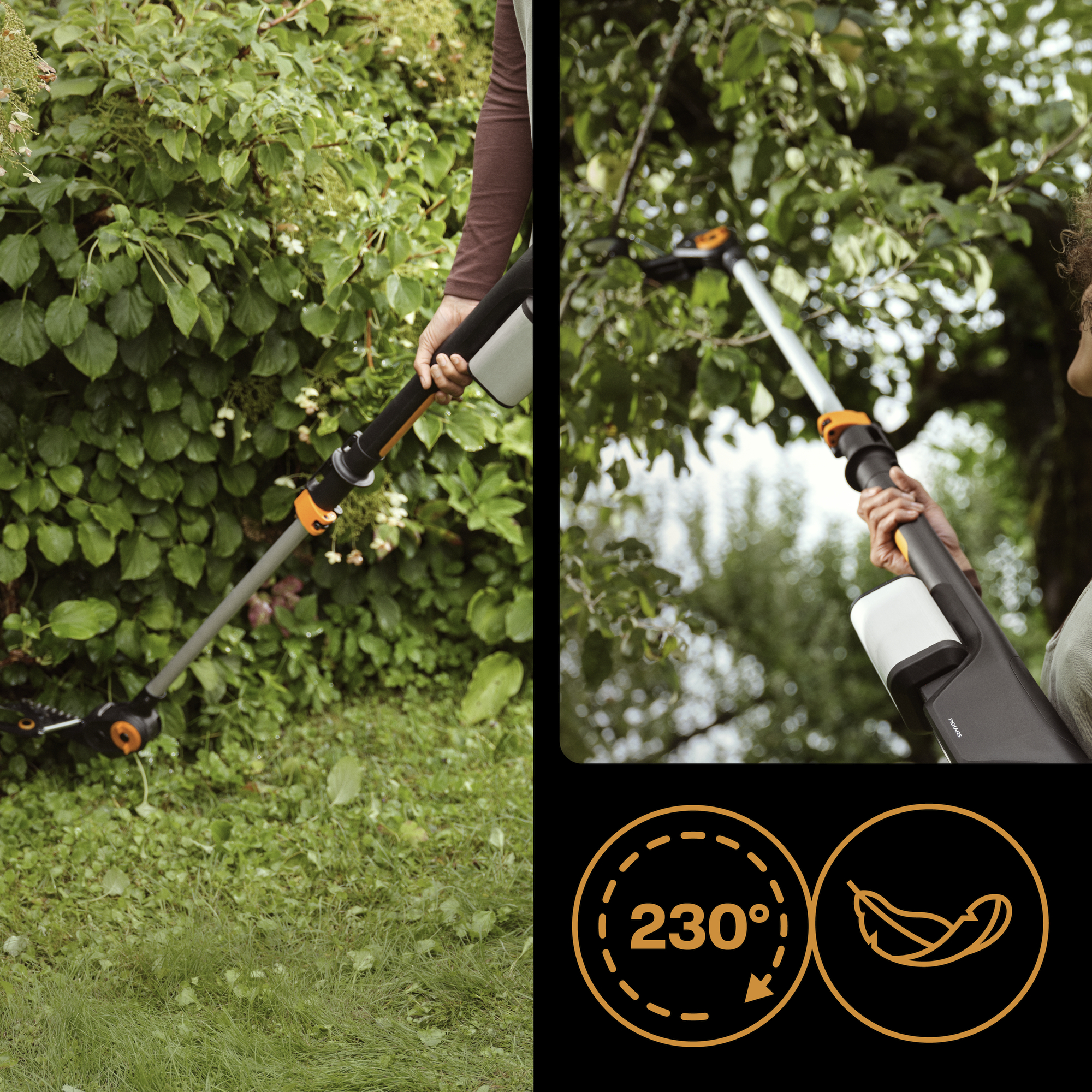 Fiskars akuoksalõikur on teleskoopvarrega, millega lõikad kuni 32 mm oksi kuni 3,4 m kõrguselt. Reguleeritav lõikenurk kuni 230º tagavad mugava ja täpse töö.