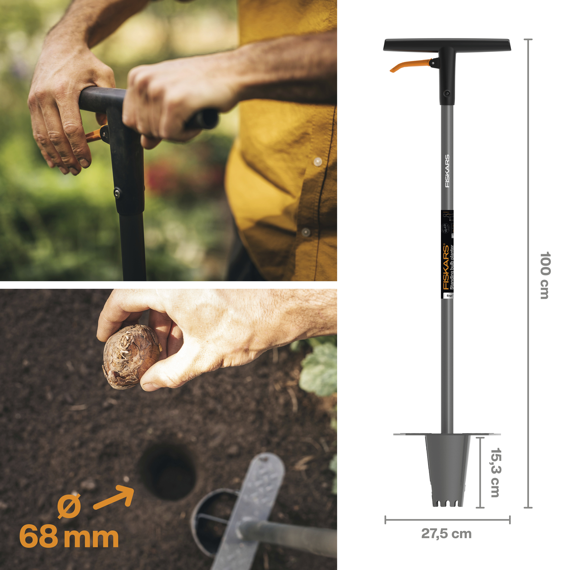 Fiskarsi ERGO-seeria pikk lillesibula pakub nutikamat ja ergonoomilisemat viisi sibulate ja väikeste istikute istutamiseks. Vaid mõne lihtsa liigutusega saate teha augu ja katta selle mullaga ilma, et peaksite põlvitama või küürutama ning koormama oma põlvi ja selga. Kahepoolse libisemisvastase kattega astmelaua ja koonuse sakilise serva abil saab teha ka üsna kõvasse pinnasesse augu. Istutussügavus 15 cm. Taimeistuti pikkus 100 cm. Istuti vars on valmistatud vastupidavast terasest, mis kestab aastaid.